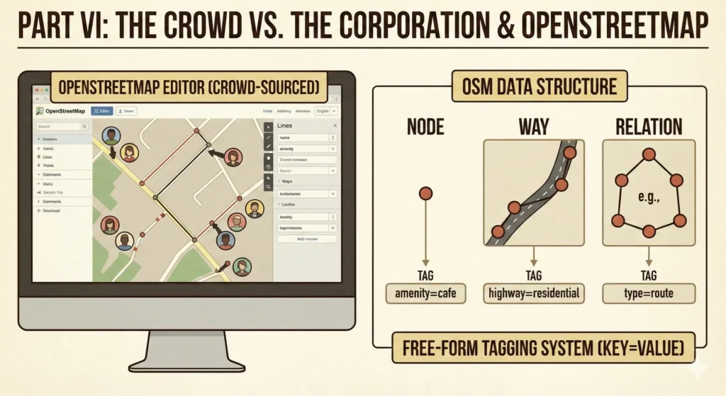 By the mid-2000s, the data duopoly (Navteq/Tele Atlas) was stifling innovation. Their data was prohibitively expensive. In 2004, Steve Coast, a British physics student, founded OpenStreetMap with a radical idea: What if we mapped the world like we write Wikipedia?