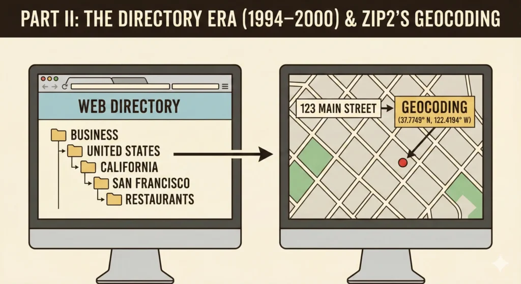 Key Innovation: Zip2’s breakthrough was geocoding—linking business addresses to map coordinates using linear interpolation. If “123 Main Street” fell 23% through the address range (100–200), the system plotted it 23% along the street segment. This technical solution enabled the first practical merger of business directories with digital maps.