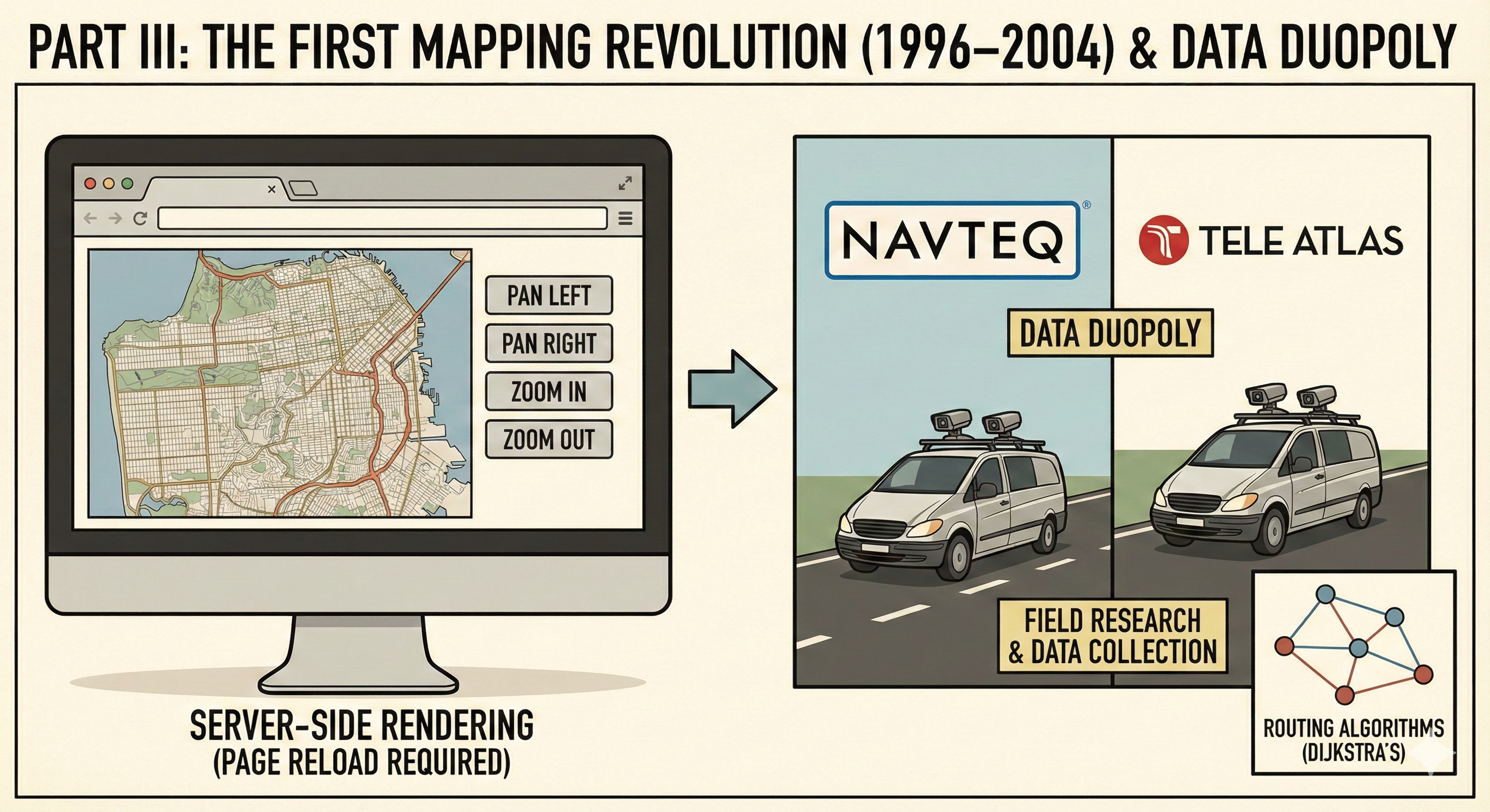 Key Insight: MapQuest’s server-side rendering was clunky by modern standards (full page reloads for each pan), but it democratized access to dynamic routing. Behind the scenes, Dijkstra’s algorithm calculated optimal paths through road networks. The real “underlying technology” was the expensive, physically-collected road data from Navteq and Tele Atlas—a duopoly that created massive barriers to entry.