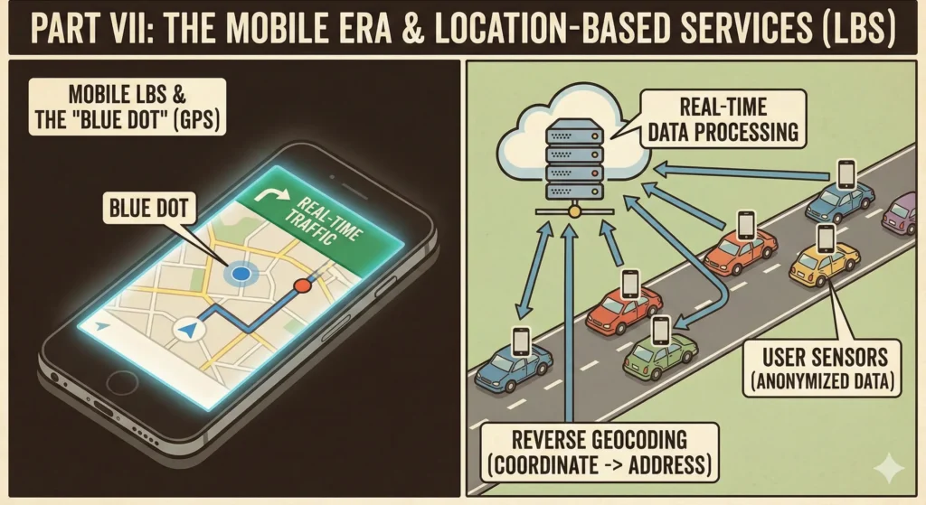 The Final Revolution: Smartphones turned location from something you typed into something that’s always known. GPS enabled reverse geocoding (coordinates → address), creating the “blue dot” that shows where you are. But the real breakthrough was turning users into sensors—millions of phones sending speed and location data created real-time traffic information. Stream processing architectures (Apache Kafka, Google’s internal tools) aggregate these millions of pings per second, anonymize them, and update routing graph edge weights in real-time. The loop closed: users became both consumers and producers of location data.