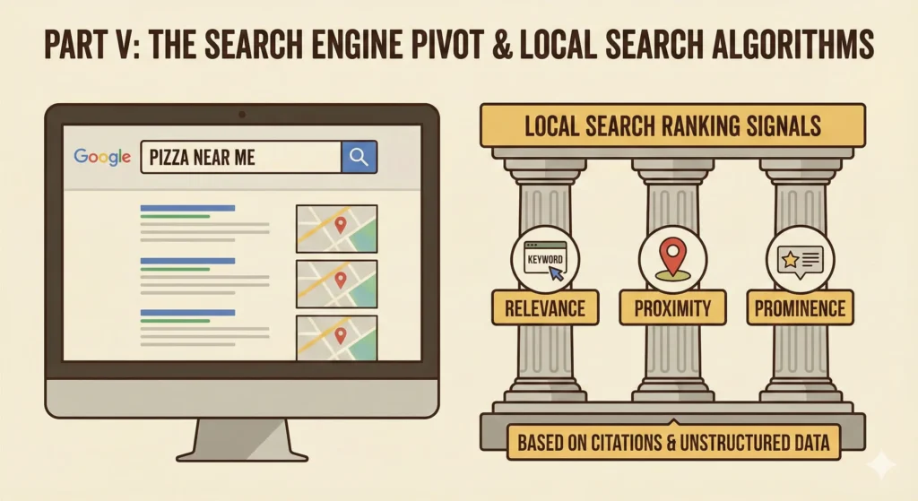 Key Innovation: Local Search merged structured directory data with unstructured text retrieval. Instead of browsing categories, users could type natural queries like “Pizza near me.” The algorithm ranked results using three signals: Relevance (category match), Proximity (distance from user), and Prominence (citations, reviews, check-ins). Google crawled the web for NAP citations—when multiple sites mentioned the same business address, it increased confidence in the listing’s accuracy.