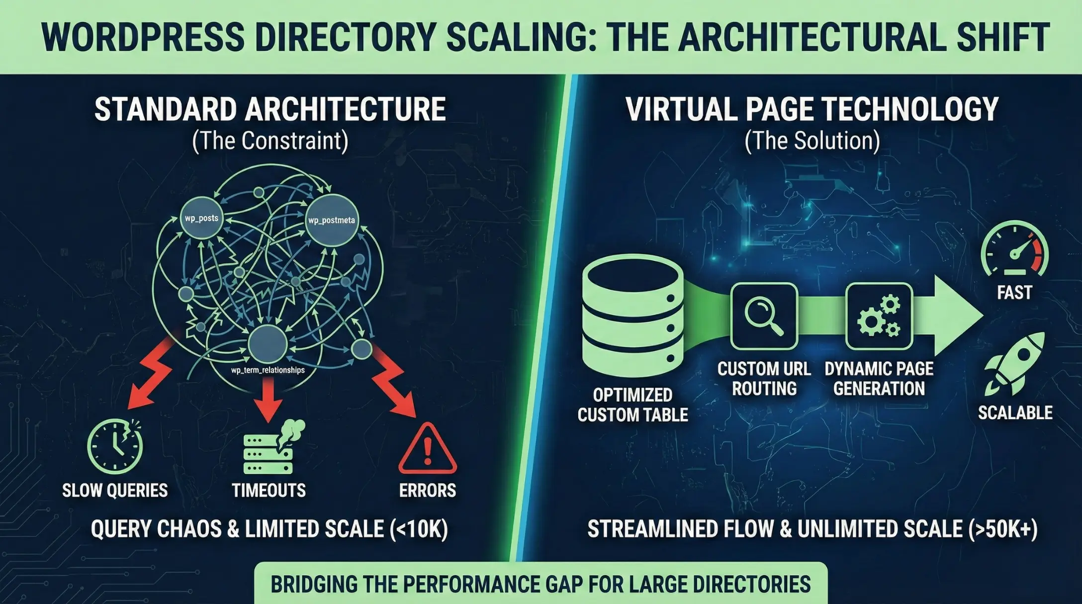 Instead of creating 50,000 WordPress post objects, virtual page architecture stores listings in custom database tables and generates pages dynamically on-demand through WordPress’s rewrite system.